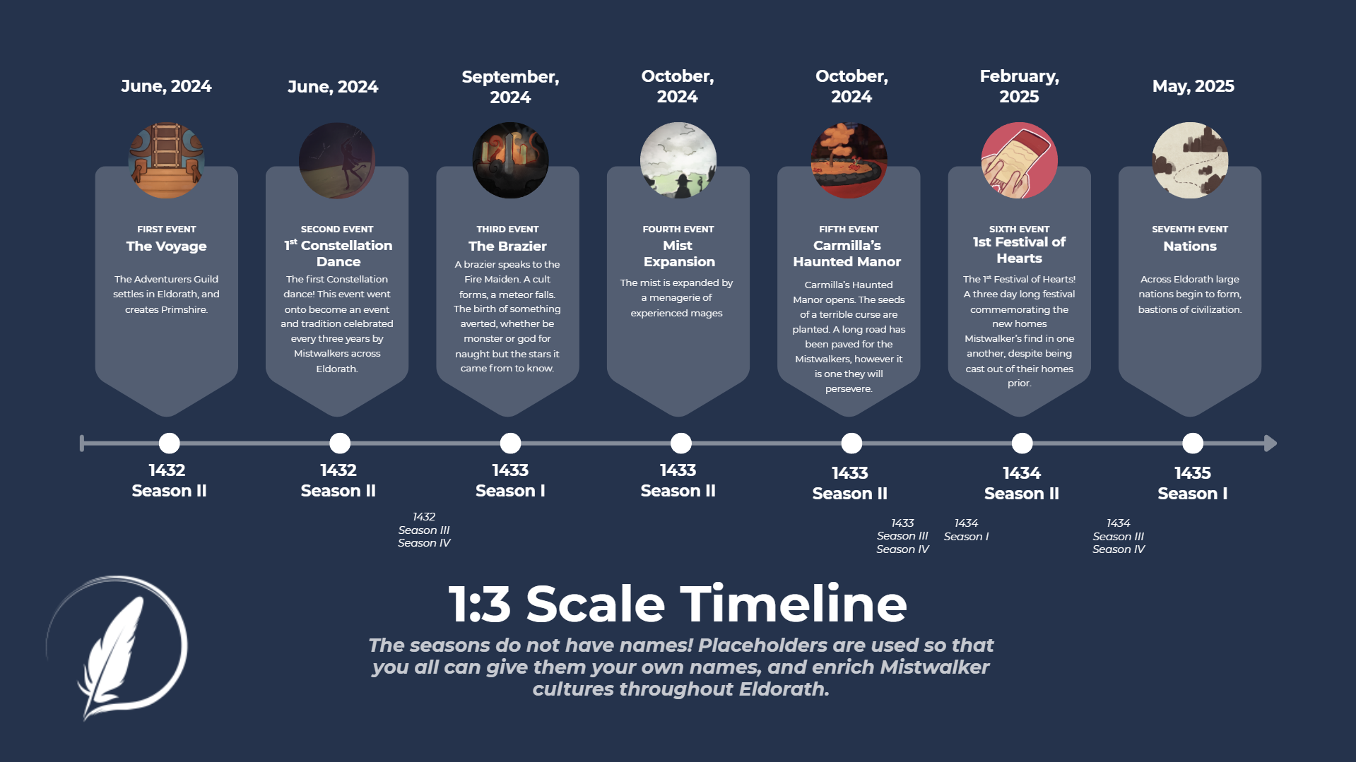 The months utilize placeholder names, because we want Mistwalker cultures and nations to come up with their own names for the seasons of Eldorath! Each season is magical in nature, and unique. Pay attention to the weather flash pings to determine what happens during a season.