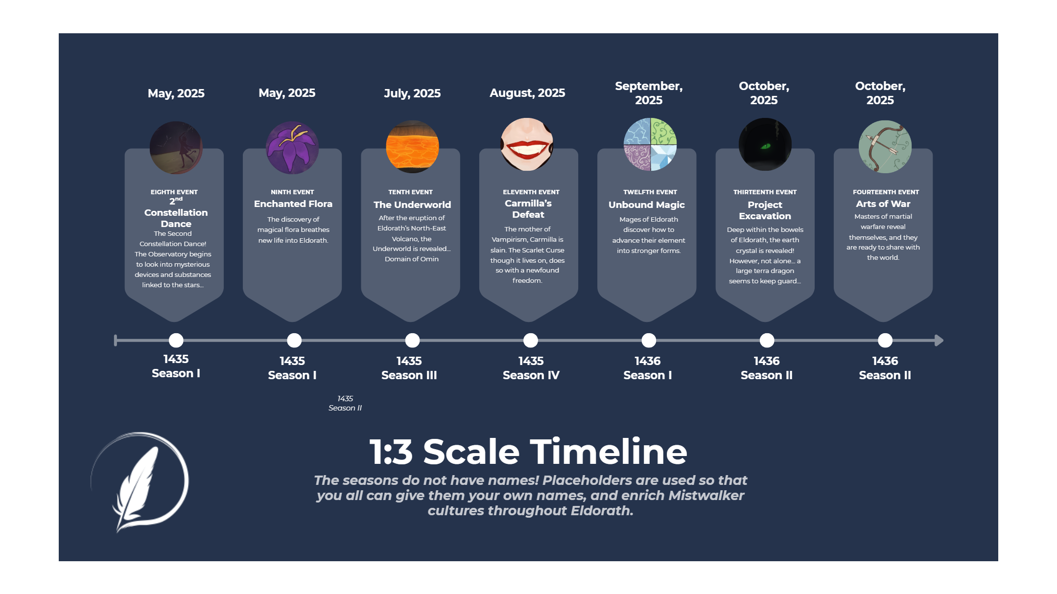 We have finally officialized a timescale that Eldorath will run on. Based on heavy feedback from our community in this suggestion, we’ve opted for a 1:3 timescale. This means that 1 in-game year is the equivalent of 4 real-life months and over the span of 1 real-life year, 3 in-game years will have passed.